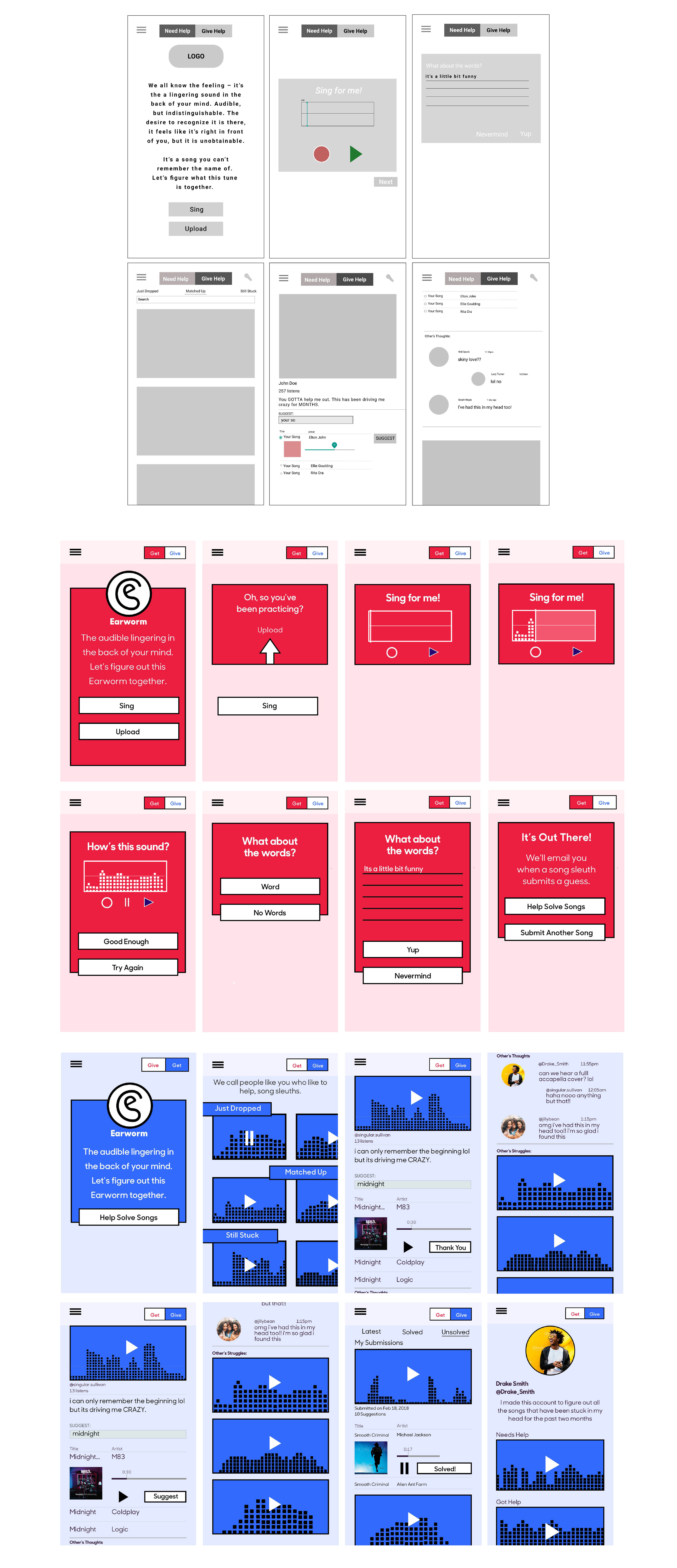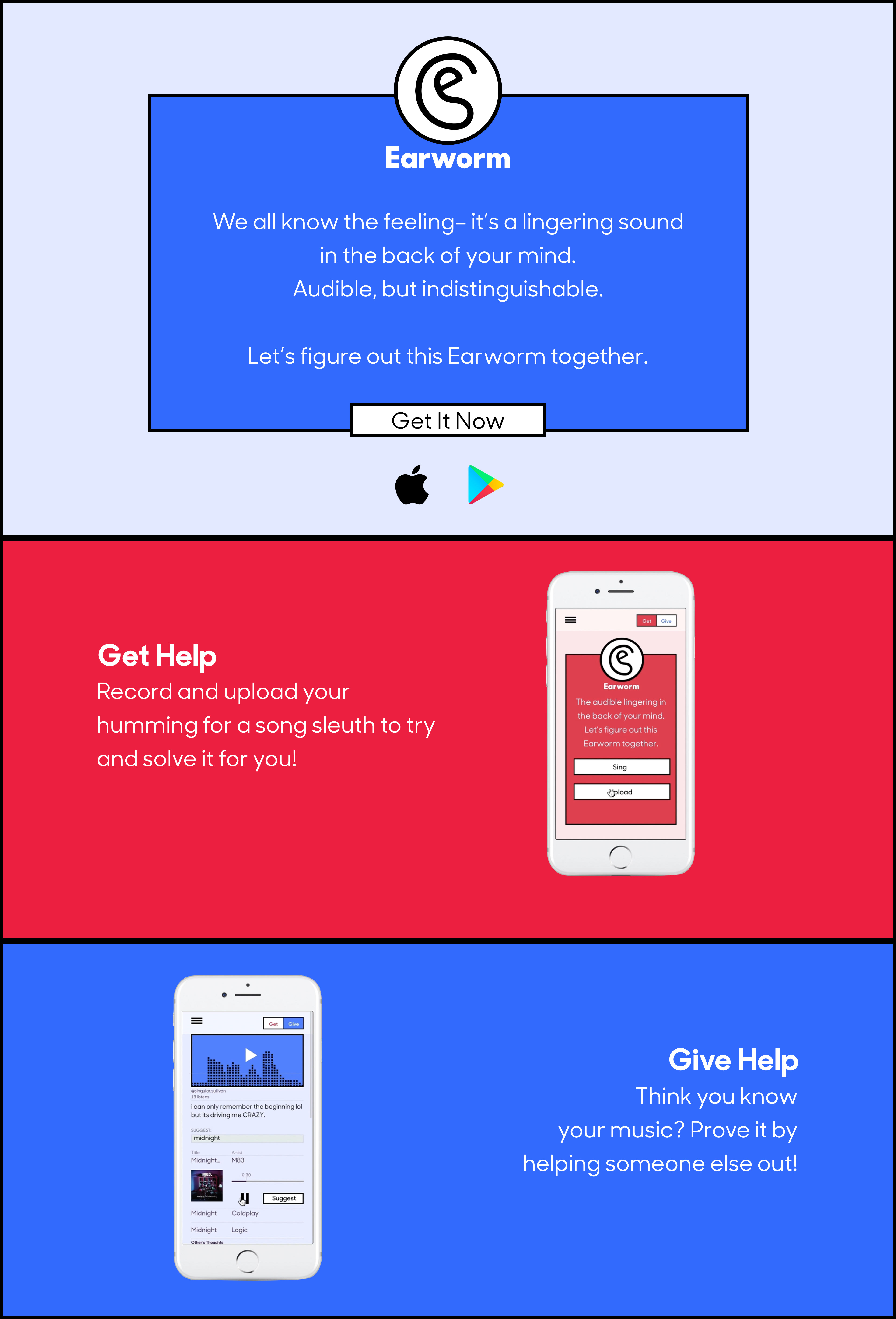 Problem: As humans, we can get songs stuck in our head but have no idea what they're called. Solution: I designed Earworm as an app that encourages users to helps others identify those mysterious melodies.