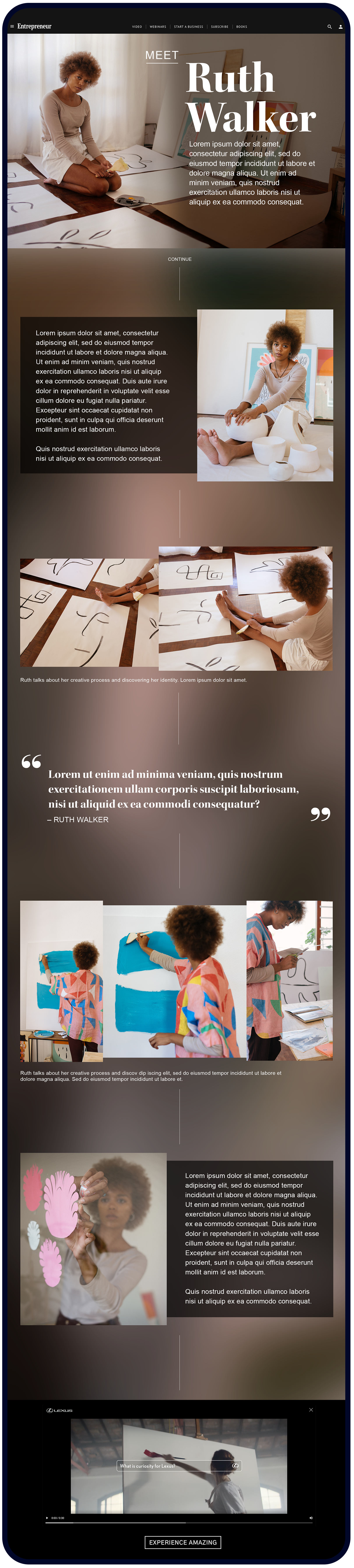 Problem: Banner ads are boring, and Lexus wanted to create content that associated human artistry with their brand. Solution: I designed an immersive and engaging full bleed, digital ad that showcases an artist and their work.